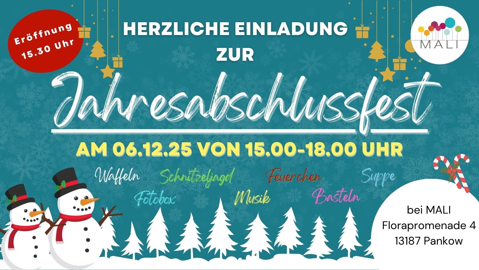 🎉✨Unser Jahresabschlussfest steht vor der Tür! ✨🎉 Wir laden euch herzlich ein, mit uns das Jahr gemütlich ausklingen zu lassen! ❄️🎄 📅 Wann? 01.12.2024, von 15:00 bis 18:00 Uhr 📍 Wo? Bei MALI, Florapromenade 4, 13187 Pankow Freut euch auf: 🌟 Leckere Suppe, Kuchen & Popcorn 🍷 Warmen Glühwein und Punsch 📸 Eine lustige Fotobox 🎶 Schöne Musik 🔥 Ein gemütliches Feuerchen 🖌️ Kreatives Basteln 🧸 Spiele für die Kleinen und Großen und tolle Preise Und natürlich jede Menge gute Laune und Weihnachtsstimmung! 🎅❄️ Kommt vorbei und feiert mit uns – wir freuen uns riesig auf euch! 🥰✨