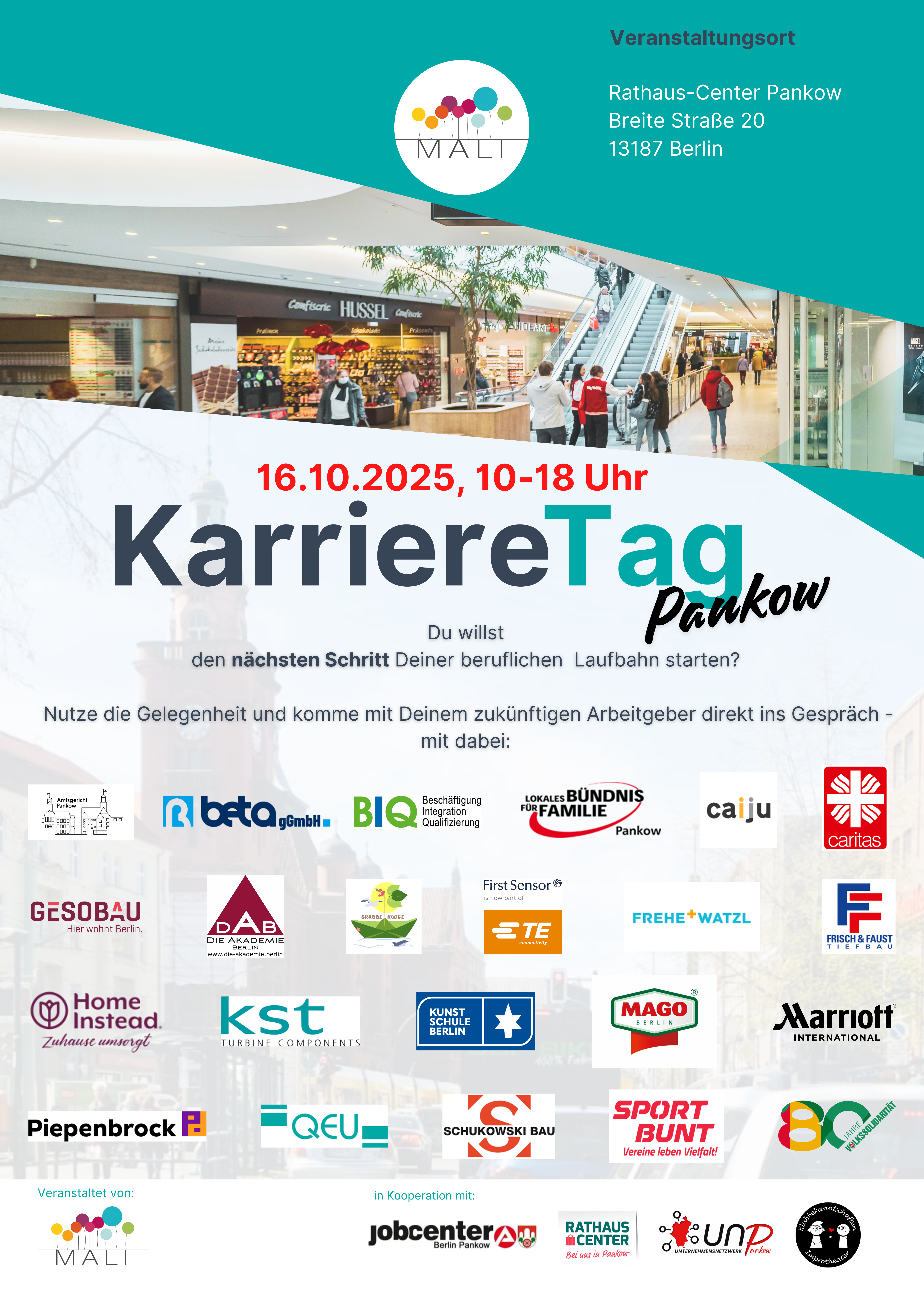 Am 16. Oktober 2025 verwandelt sich das Rathaus-Center Pankow in einen Treffpunkt für berufliche Perspektiven. Von 10:00 bis 18:00 Uhr präsentieren sich Unternehmen unterschiedlichster Branchen und zeigen, welche Möglichkeiten für Ausbildung, Berufseinstieg und Karriere in Pankow und Umgebung bestehen. Der KarriereTag Pankow bietet Jugendlichen, Berufseinsteiger:innen und Jobsuchenden eine ideale Plattform, um direkt mit Arbeitgeber:innen ins Gespräch zu kommen, Fragen zu stellen und wertvolle Kontakte zu knüpfen. Das erwartet die Besucher:innen: • Persönliche Gespräche mit Unternehmen aus vielfältigen Branchen • Informationen zu Ausbildungsplätzen, Praktika und Stellenangeboten • Tipps für den gelungenen Berufsstart • Impulsvorträge • Kinderbetreuung • Lebenslauf-Check • Escape-Room Mit diesem Aktionstag möchten wir Talente und Betriebe zusammenbringen, Orientierung geben und neue Chancen eröffnen – direkt hier vor Ort in Pankow. 📍 Ort: Rathaus-Center Pankow, Breite Straße 20, 13187 Berlin 📅 Datum: 16. Oktober 2025 🕙 Zeit: 10:00 – 18:00 Uhr 💡 Eintritt frei